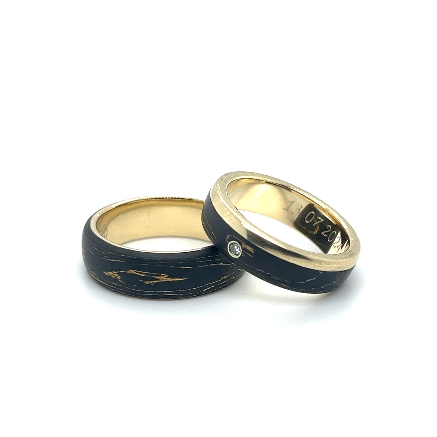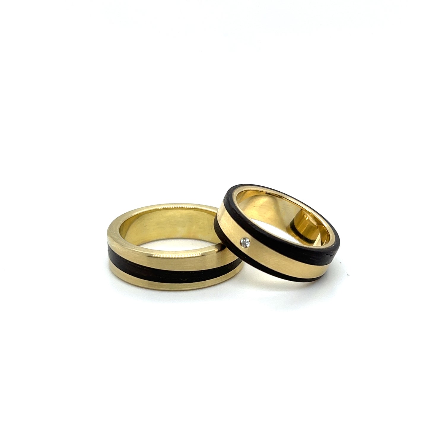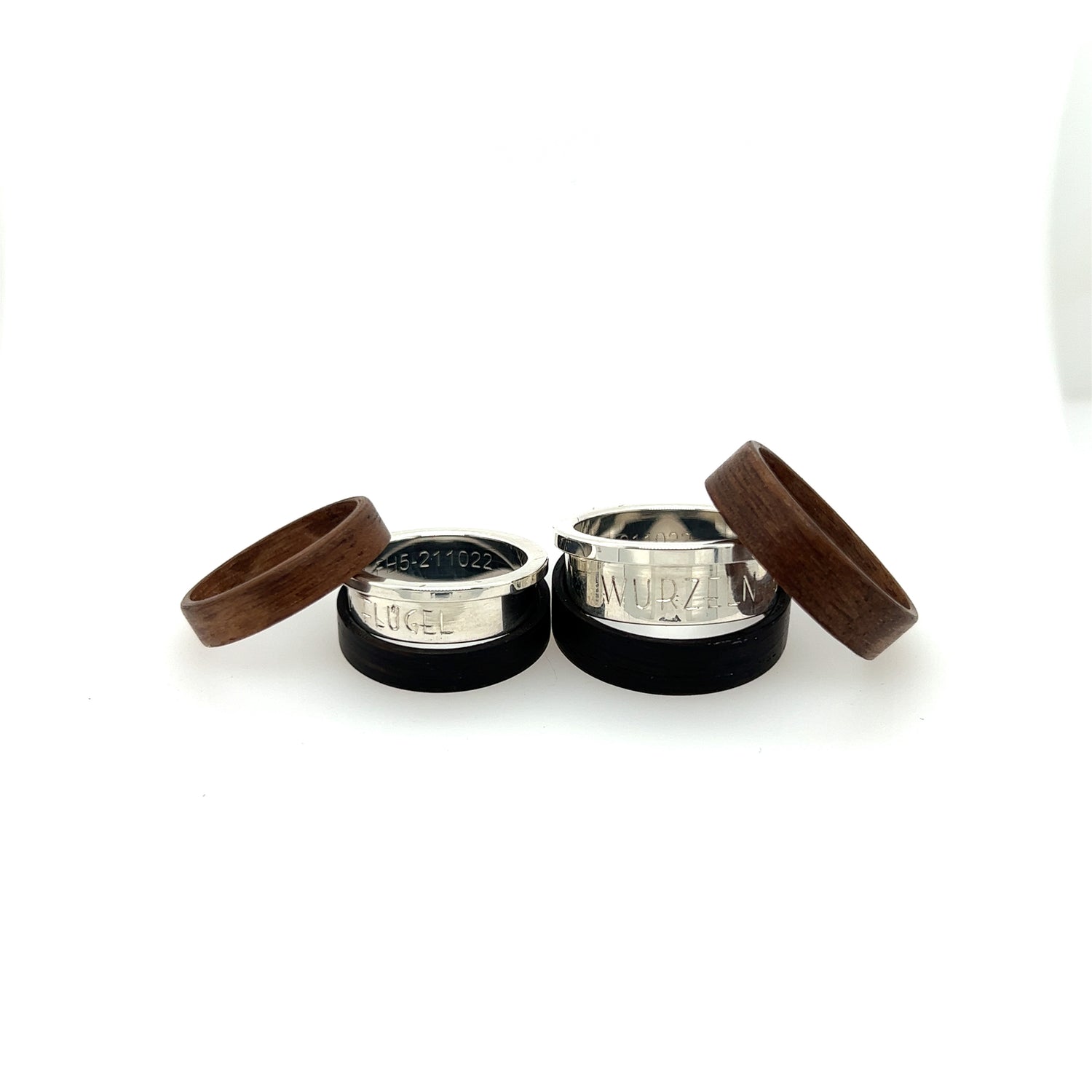 Durch eine spezielle Machart kombinieren wir seit einigen Jahren einen Edelmetallgrundring mit Holzaufsätzen, die jederzeit selbst gewechselt und ersetzt werden können. Ursprünglich als Accessoire entworfen, hat sich dieses Konzept besonders als Trauring bewährt, da neben der Haltbarkeit auf lange Sicht auch die Individualisbarkeit dieses Modells fast grenzenlos ist.