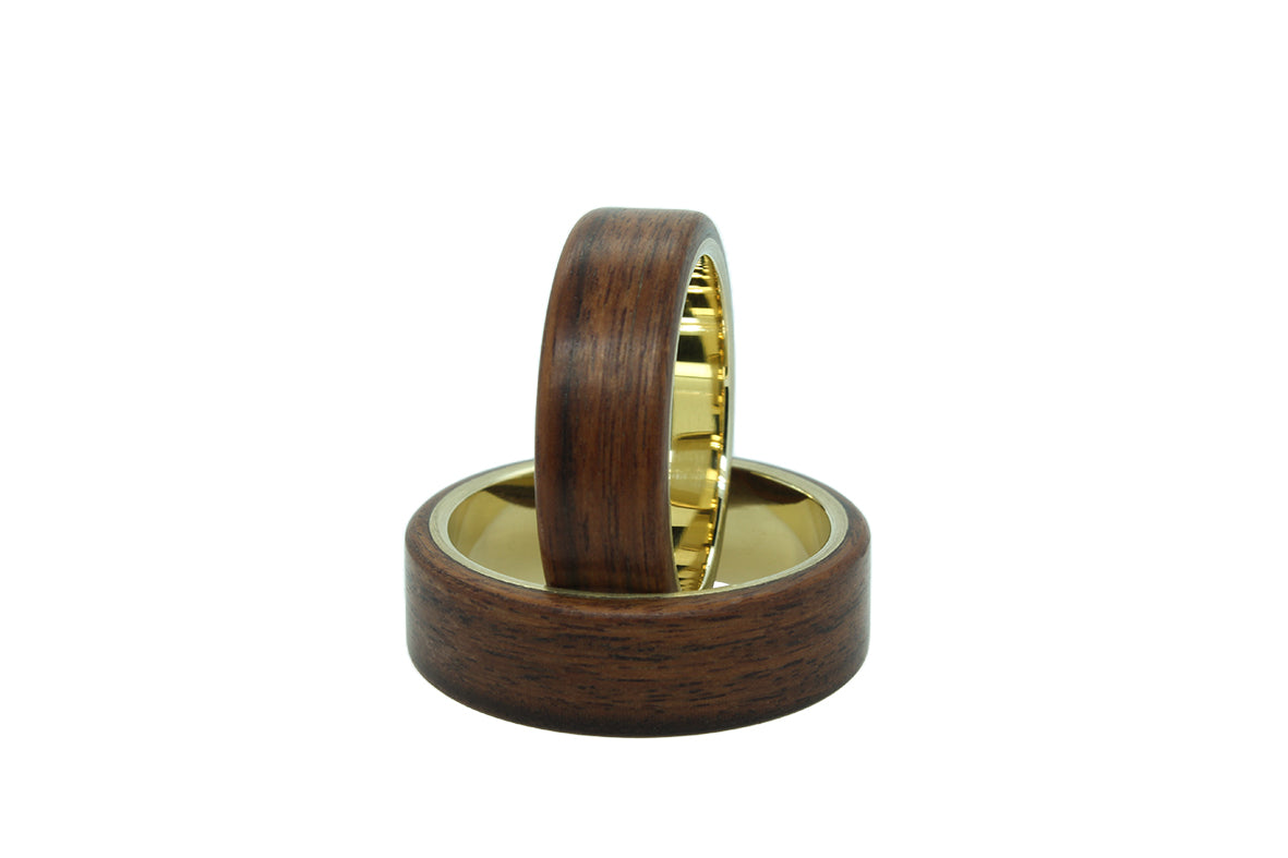 Die natürliche Optik eines Holzrings gepaart mit der Dauerhaftigkeit eines Edelmetallrings. Nicht zuletzt sind diese Modelle seit Jahren die Favoriten als Trauring oder Verlobungsring. Eine Aufarbeitung oder auch der Ersatz des Holzes ist jederzeit möglich und die Ringe werden auch nach Jahren wieder wie neu.