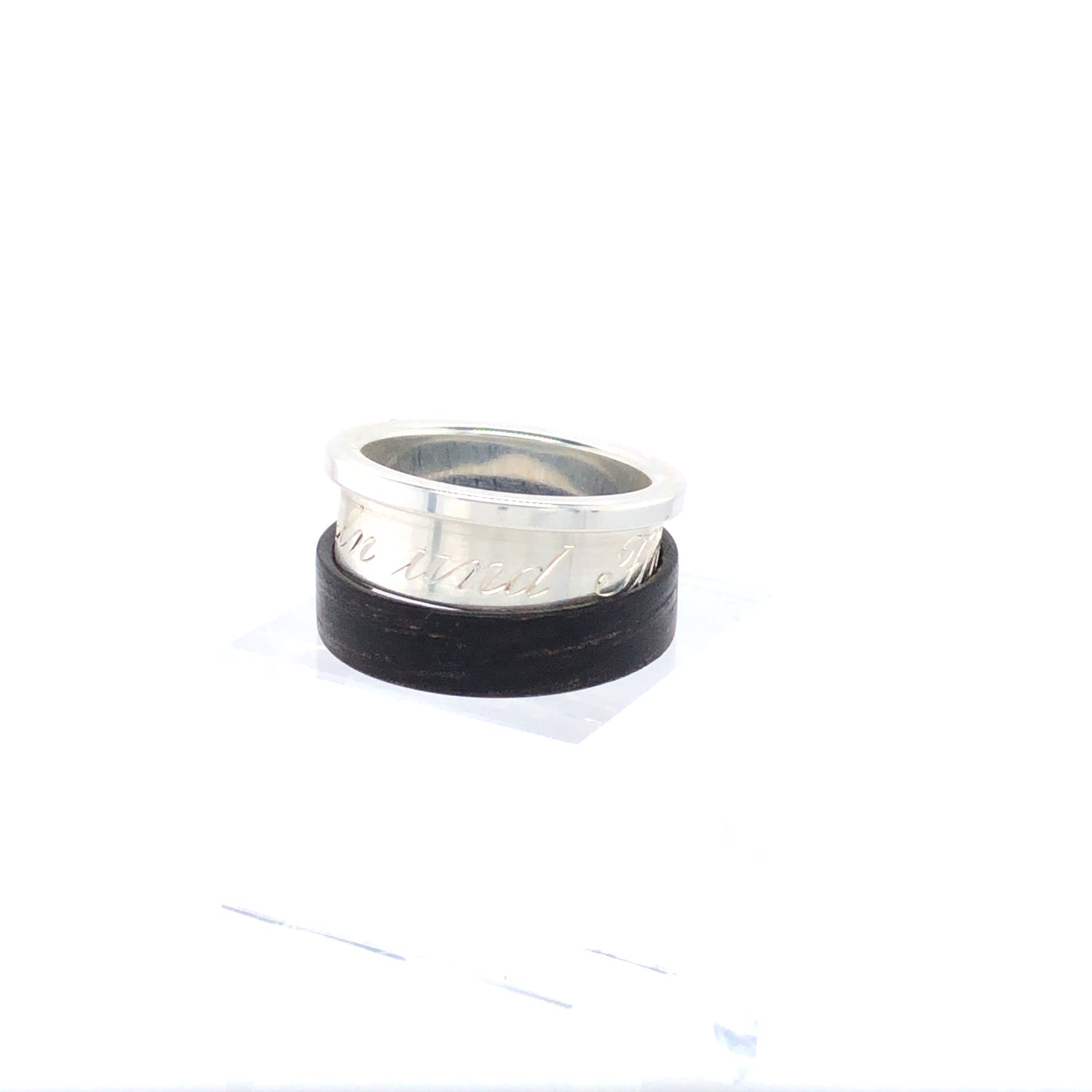 Durch die spezielle Passung und die aufwendige Verarbeitung des Holzes, lässt sich bei diesem Ring die Holzapplikation selbst wechseln.
